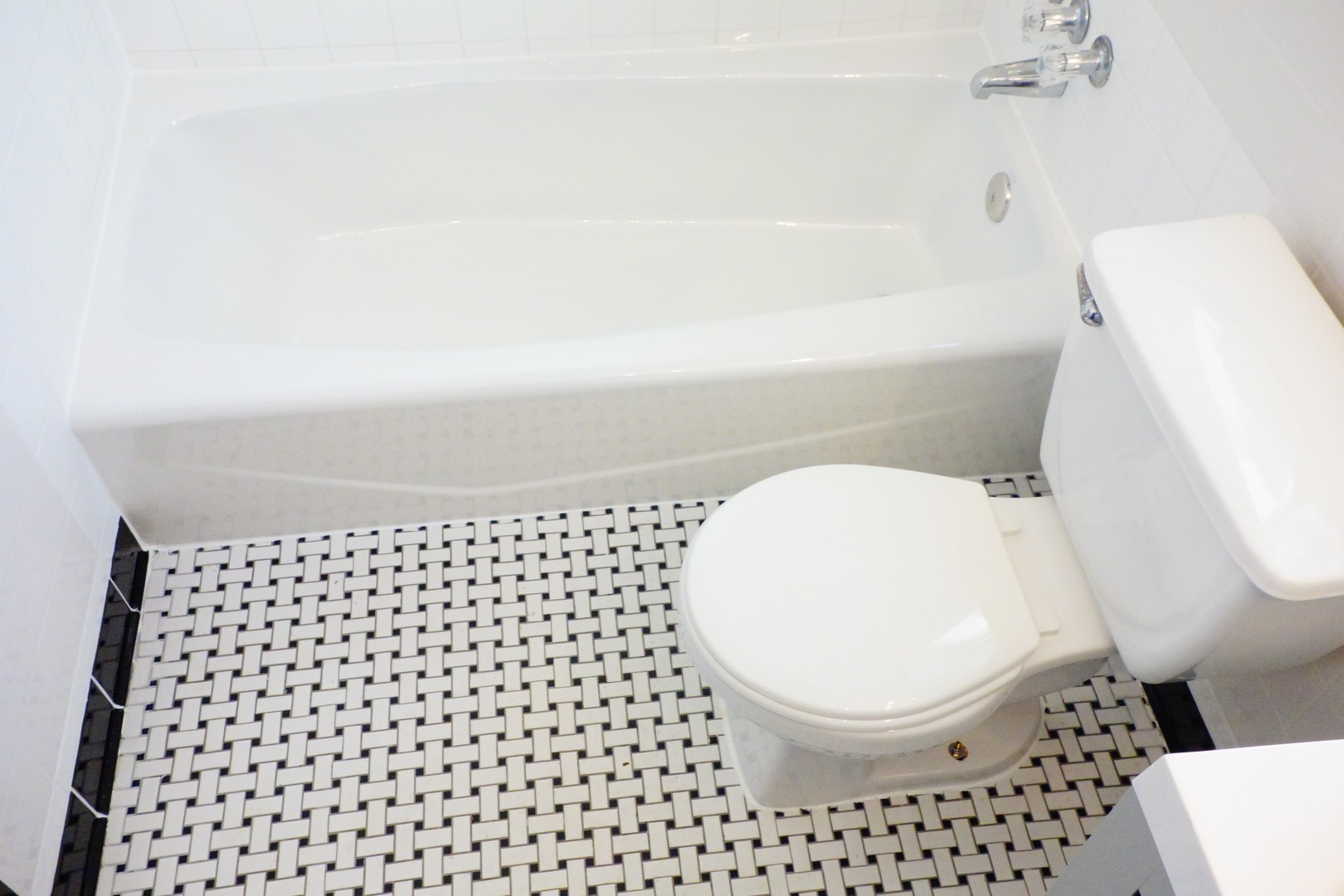 Fully renovated bathroom with new tile and a gorgeous Kohler cast iron bathtub