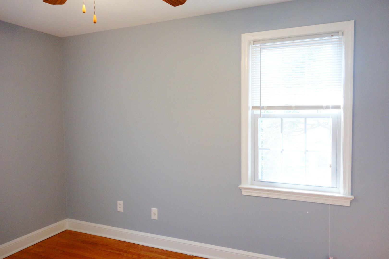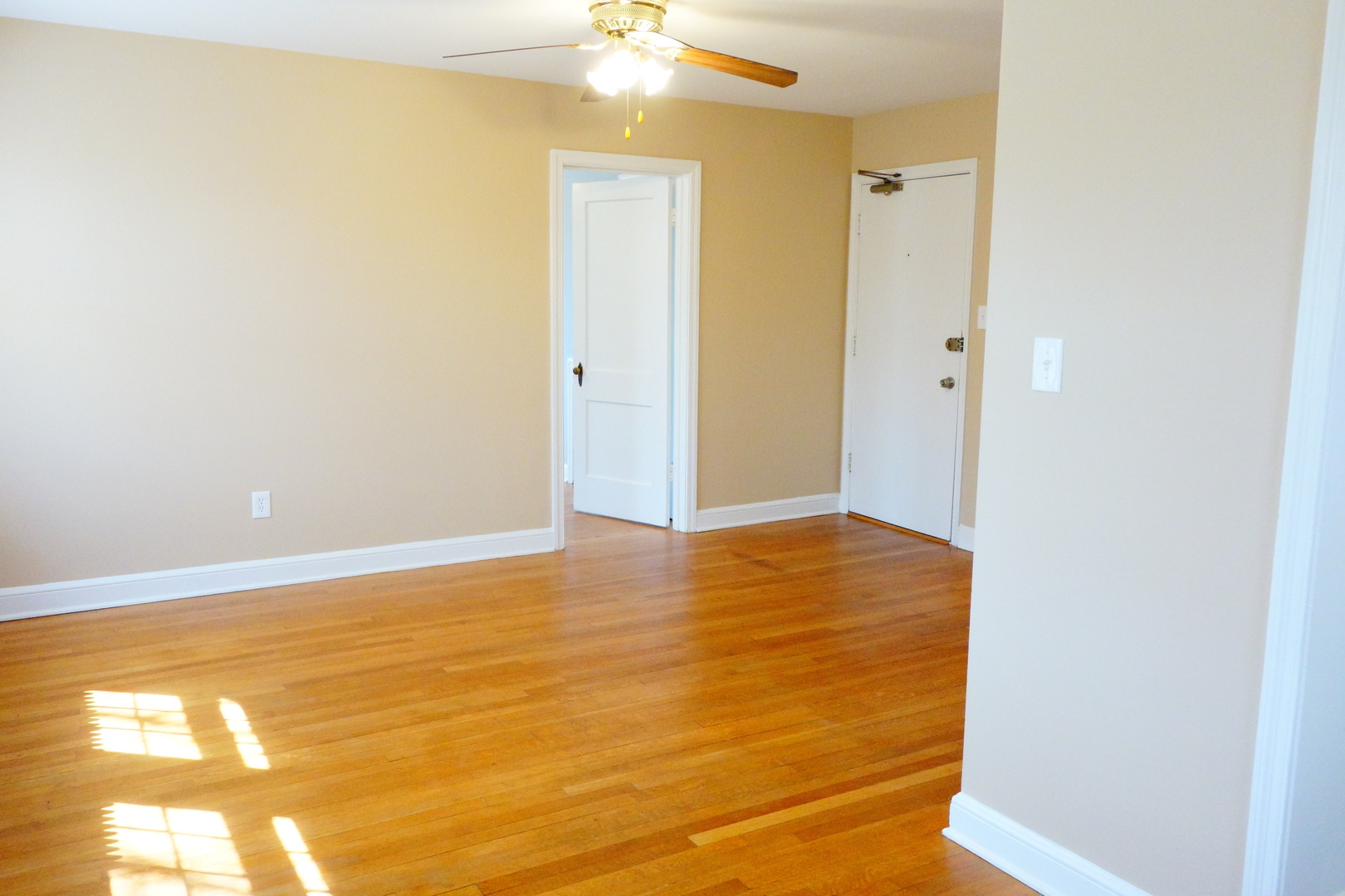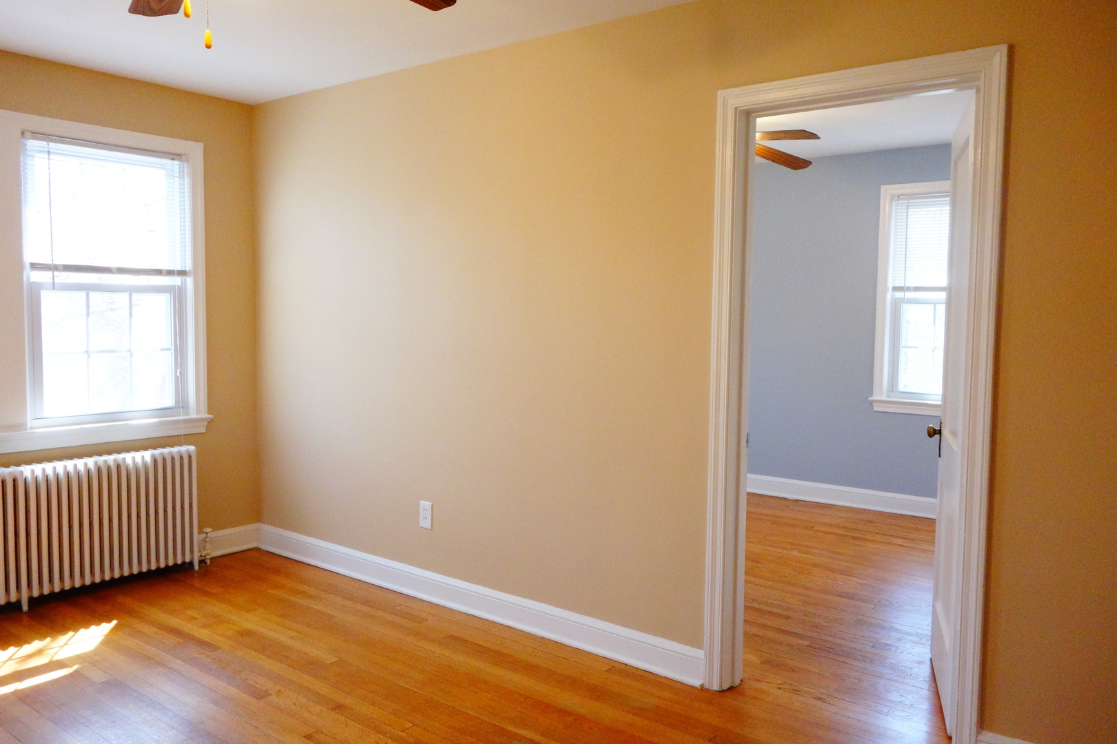 There are ceiling fans in the living room and the bedroom.